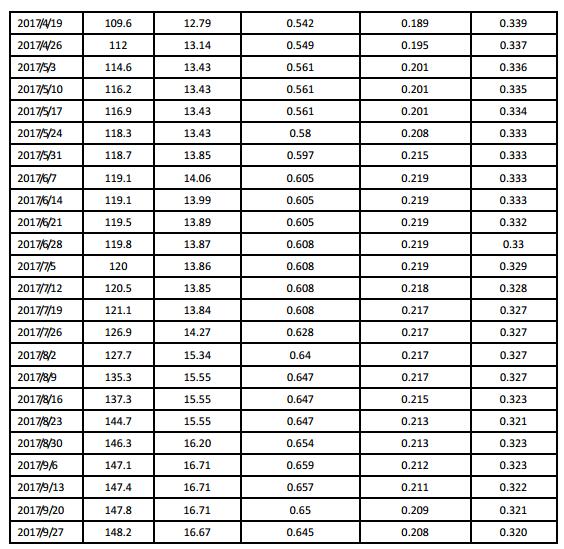 2017年第三季度多晶硅價格延續(xù)上漲走勢,從7月初的12.00萬元/噸,一路上漲到9月底的14.82萬元/噸,增幅為23.5%。其中7-8月份增速較急,到8月底的14.63萬元/噸,漲幅已達21.9%,隨后增速放緩,8月底到9月底一月內增幅僅為1.3%。