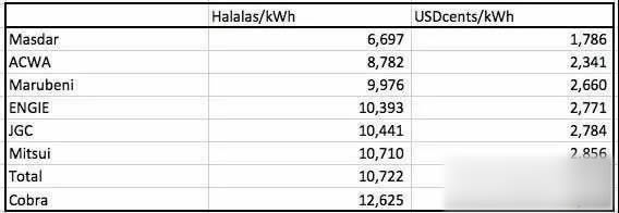 沙特阿拉伯北部Al Jouf省Sasaka 300兆瓦光伏項(xiàng)目競(jìng)標(biāo)結(jié)果10月3日揭曉:阿布達(dá)比Future Energy Co (Masdar)和法國(guó)EDF Energies Nouvelles聯(lián)合報(bào)價(jià),平準(zhǔn)成本為1.786美分/千瓦時(shí),創(chuàng)光伏報(bào)價(jià)最低紀(jì)錄。沙特阿拉伯Acwa Power公司報(bào)出2.341美分/千瓦時(shí),排在第2位;其他公司報(bào)價(jià)見(jiàn)下表。
