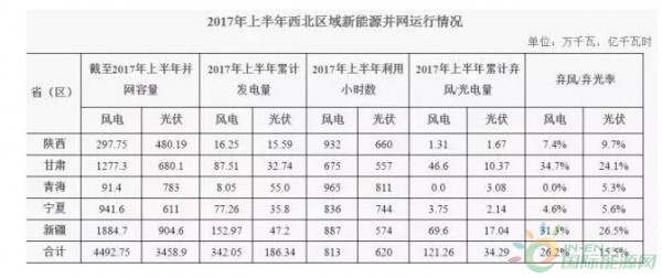 從2017年上半年與2016年上半年的西北五省的對(duì)比來看,我國(guó)的電力過剩情況比較嚴(yán)重。2017年上半年,西北五?。▍^(qū))光伏累計(jì)并網(wǎng)容量3458.9萬(wàn)千瓦,發(fā)電量186.34億千瓦時(shí),棄光電量34.29億千瓦時(shí),棄光率15.5%;風(fēng)電累計(jì)并網(wǎng)容量達(dá)到4492.75萬(wàn)千瓦,發(fā)電量342.05億千瓦時(shí),棄風(fēng)電量利用小時(shí)數(shù)813小時(shí),棄風(fēng)電量121.26億千瓦時(shí),棄風(fēng)率26.2%。雙棄現(xiàn)象并沒有得到明顯改善。