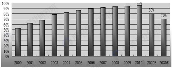 2000-2030年全球并網(wǎng)系統(tǒng)占總安裝量比例及預(yù)測(單位:%)