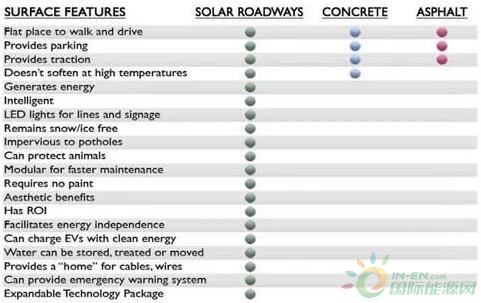 光伏發(fā)電路面設(shè)想在 2006 年由美國(guó)的一對(duì)科學(xué)家夫婦提出并開始研究。布魯索夫婦發(fā)明出一種正六邊形的太陽(yáng)能電池板(SolarRoadway),其表面是一種超耐磨的特殊玻璃,承重最高達(dá) 125 噸,能保證汽車的安全行駛。Solarroadways 官網(wǎng)對(duì) Solarroadway、混凝土、瀝青三種不同路面材料做了對(duì)比。