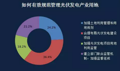 此次調(diào)查中,占受訪者比例最高的為合理布局光伏發(fā)電建設(shè)項(xiàng)目,為36.4%。有受訪者表示,在光伏電站中變電站及運(yùn)行管理中心、集電線路、場(chǎng)內(nèi)道路等光伏發(fā)電建設(shè)項(xiàng)目規(guī)劃時(shí),要優(yōu)先考慮可以使用未利用的土地,有效避開永久基本農(nóng)田等非建設(shè)用地。