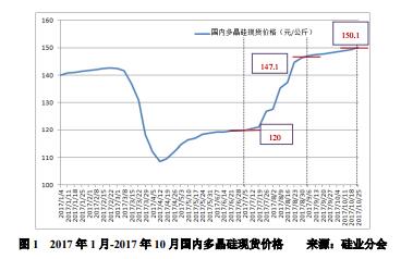 一、多晶硅價(jià)格持穩(wěn)微漲2017年9-10月份多晶硅價(jià)格持穩(wěn)微漲,從9月初的14 71萬(wàn)元 噸,上漲到10月底的15 01萬(wàn)元 噸,增幅僅有2 0%,相比7-8月份的價(jià)格漲幅21 9%增速有所放緩。10月份多晶硅均價(jià)14 95萬(wàn)元 噸,環(huán)比增
