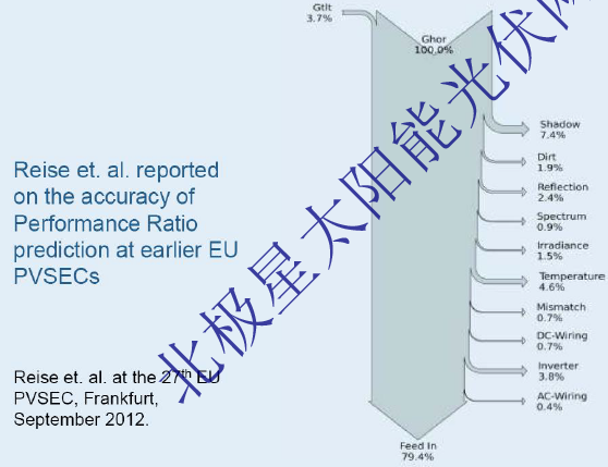 IEA給出的對(duì)于PR效率鏈損失的估計(jì)預(yù)測(cè):遮擋損失:7.4%;積塵:1.9%;反射:2.4%;光譜:0.9%;輻射量:1.5%;溫度:4.6%;失配:0.7%;DC線損:0.7%;逆變器:3.8%;AC線損:0.4%.