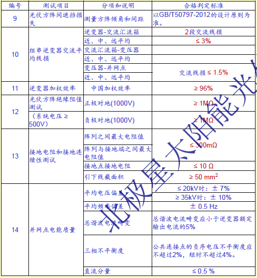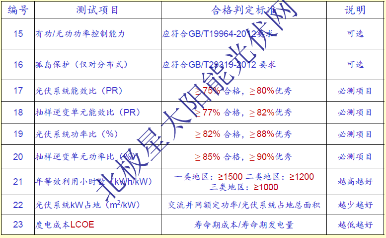 1、對(duì)于監(jiān)控系統(tǒng)完備的大型光伏電站,建議采用“PR”值來(lái)定量評(píng)估系統(tǒng)的質(zhì)量,并認(rèn)真完成14個(gè)效率測(cè)試項(xiàng);