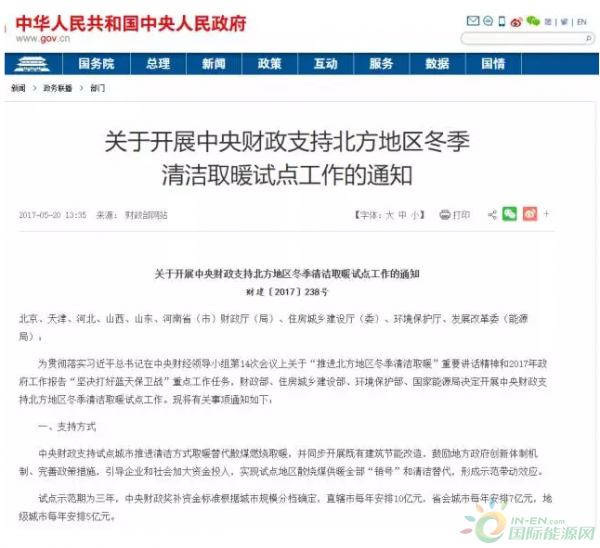 今年5月份,國家發(fā)布《關(guān)于開展中央財政支持北方地區(qū)冬季清潔取暖試點(diǎn)工作的通知》。