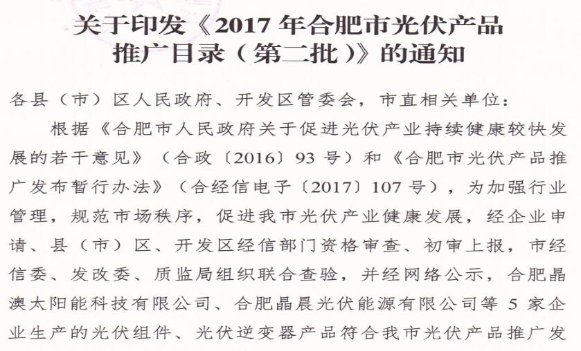 原標(biāo)題:關(guān)于印發(fā)《2017年合肥市光伏產(chǎn)品推廣目錄(第二批)》的通知