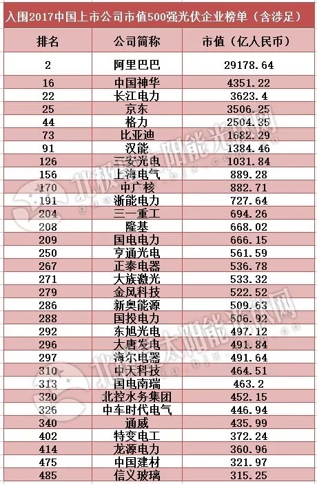 2017中國上市公司市值500強:漢能、隆基、正泰等光伏企業(yè)入圍