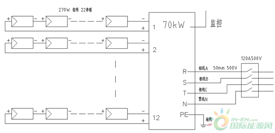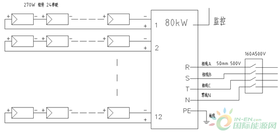 方案2,系統(tǒng)采用60片280Wp光伏組件,24串12并共288塊組成,總功率 80.64KWp。采用1臺(tái)80KW光伏逆變器,接入380V線,送入光伏并網(wǎng)接入配電箱,再接入10kV柱上變壓器380V母線端。