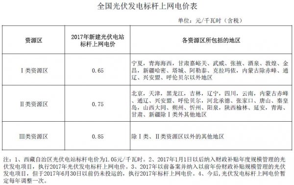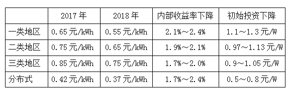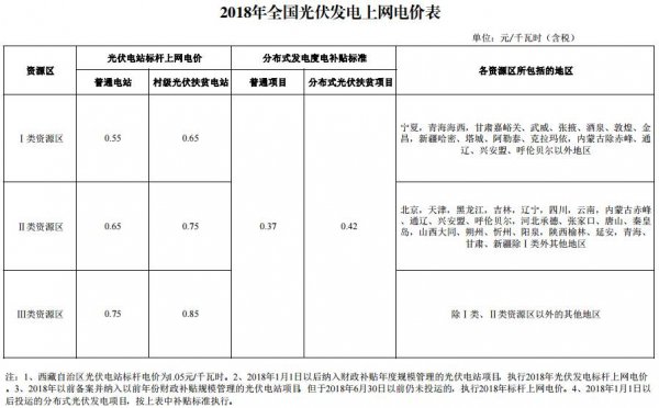 國(guó)家發(fā)展改革委于2017年12月22號(hào)下發(fā)《關(guān)于2018年光伏發(fā)電項(xiàng)目?jī)r(jià)格政策的通知》,要求降低2018年1月1日之后投運(yùn)的光伏電站標(biāo)桿上網(wǎng)電價(jià),Ⅰ類(lèi)、Ⅱ類(lèi)、Ⅲ類(lèi)資源區(qū)標(biāo)桿上網(wǎng)電價(jià)分別調(diào)整為每千瓦時(shí)0.55元、0.65元、0.75元(含稅);村級(jí)光伏扶貧電站上網(wǎng)電價(jià)分別為0.65元、0.75元、0.85元;通知規(guī)定,2018年1月1日以后投運(yùn)的、采用“自發(fā)自用、余量上網(wǎng)”模式的分布式光伏發(fā)電項(xiàng)目,全電量度電補(bǔ)貼標(biāo)準(zhǔn)降低0.05元,即補(bǔ)貼標(biāo)準(zhǔn)調(diào)整為每千瓦時(shí)0.37元(含稅)。采用“全額上網(wǎng)”模式的分布式光伏發(fā)電項(xiàng)目按所在資源區(qū)光伏電站價(jià)格執(zhí)行。