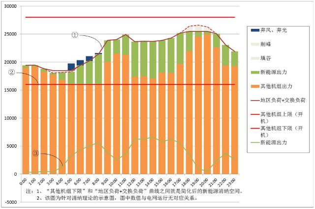 圖中曲線1代表電網(wǎng)日負(fù)荷曲線,基本構(gòu)成一般是地區(qū)負(fù)荷與區(qū)域間交換負(fù)荷之和;直線2代表本地區(qū)除新能源外,各類機(jī)組理論上能實現(xiàn)的綜合最小出力;曲線3表示新能源機(jī)組出力??梢钥吹?,曲線1和直線2之間的空間是新能源的消納空間,直線2與曲線3(綠色柱)計算疊加后,仍然超過曲線1的部分(藍(lán)色柱)就是棄電量。