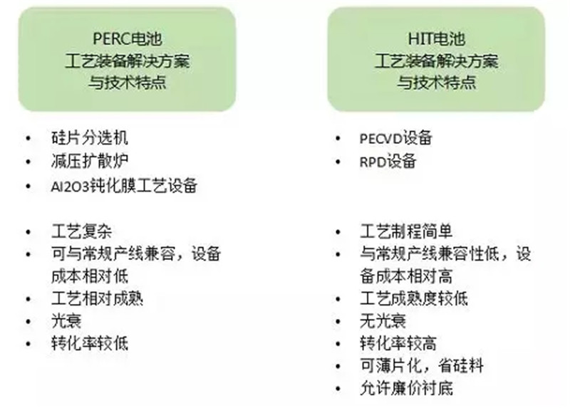 目前,國(guó)內(nèi)晶硅企業(yè)大量完成PERC技術(shù)導(dǎo)入。后期,相關(guān)企業(yè)將很有可能將PERC導(dǎo)入HIT。下圖展示了從工藝、設(shè)備與技術(shù)特性三個(gè)角度來(lái)講,PERC電池與HIT電池的差異。從下圖中可看出,PERC電池在工藝的復(fù)雜程度、產(chǎn)線的兼容性以及現(xiàn)階段工藝成熟度上勝于HIT電池,但固有的光衰問(wèn)題與轉(zhuǎn)化率問(wèn)題限制了它的發(fā)展,而HIT電池因其無(wú)光衰、高效的特性,在未來(lái)更具開(kāi)發(fā)性。