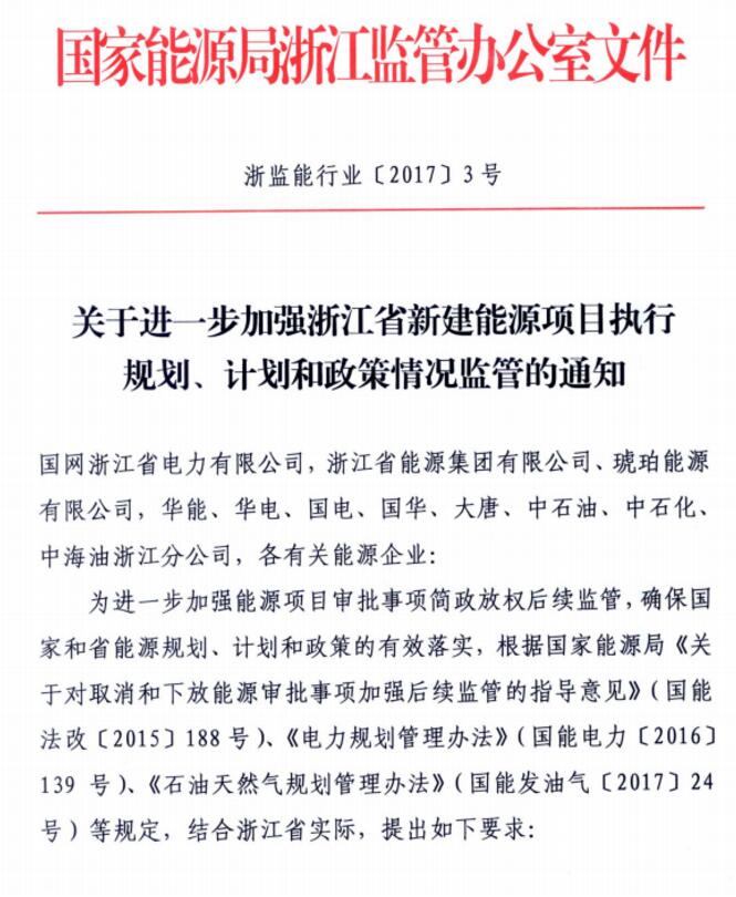 1月9日,國家能源局浙江監(jiān)管辦公開發(fā)布《關(guān)于進(jìn)一步加強(qiáng)浙江省新建能源項(xiàng)目執(zhí)行規(guī)劃、計(jì)劃和政策情況監(jiān)管的通知》,《通知》要求,浙江省新