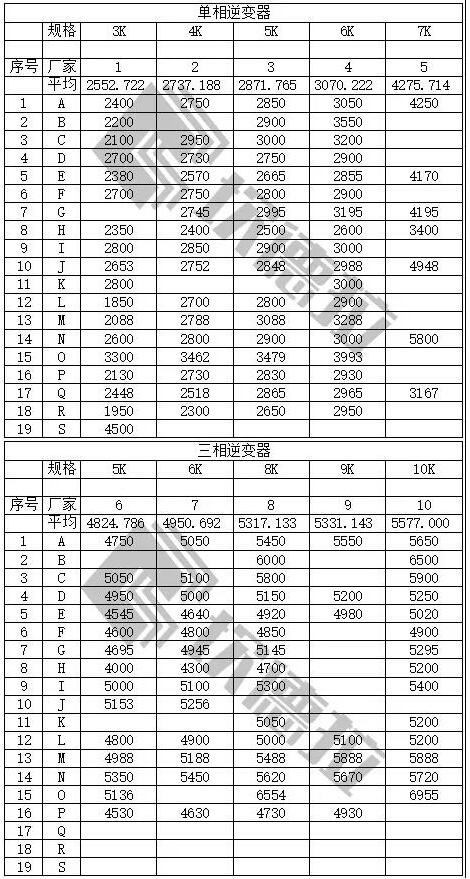 3kW、4kW、5kW、6kW、7kW單相逆變器折合單價分別為0.851元/W、0.684元/W、0.574元/W、0.512元/W、0.611元/W;