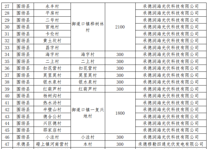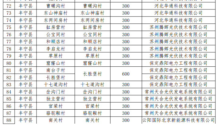 六、同意豐寧滿族自治縣村級光伏扶貧電站建設(shè)企業(yè)由豐寧滿族自治縣大元國控有限公司變更為河北華通科技有限公司、蘇州騰暉光伏技術(shù)有限公司、保定鼎陽電力工程有限公司、常州天合光伏發(fā)電系統(tǒng)有限公司、云陽國際北京新能源科技有限公司5家企業(yè)。同意石人溝鄉(xiāng)湯道溝村村級電站項目采取和石人溝鄉(xiāng)寬溝村2村聯(lián)建、分村備案的方式,建設(shè)地點變更為石人溝鄉(xiāng)寬溝村,裝機規(guī)模600千瓦;五道營鄉(xiāng)南臺子村村級電站項目和五道營鄉(xiāng)長勝堡村2村聯(lián)建、分村備案,建設(shè)地點變更為五道營鄉(xiāng)長勝堡村,裝機規(guī)模600千瓦。