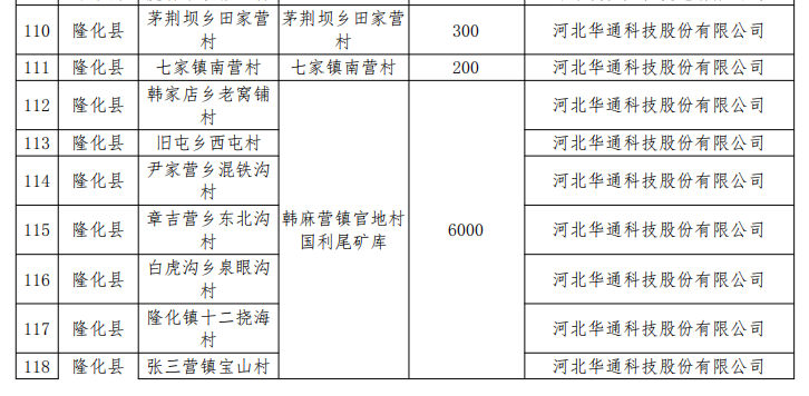 四、同意隆化縣村級光伏扶貧電站建設(shè)企業(yè)由河北華通科技股份有限公司和常州天合光伏發(fā)電系統(tǒng)有限公司變更為全部由河北華通科技股份有限公司1家企業(yè)建設(shè)。同意隆化鎮(zhèn)十二撓海村、張三營鎮(zhèn)寶山村、郭家屯鎮(zhèn)二道營村、藍旗鎮(zhèn)北溝村、唐三營鎮(zhèn)太平村、湯頭溝鎮(zhèn)鳳凰嶺村、中關(guān)鎮(zhèn)北鋪子村、韓麻營鎮(zhèn)京堂溝村、步古溝鎮(zhèn)東阿超村、韓家店鄉(xiāng)老窩鋪村、舊屯鄉(xiāng)西屯村、尹家營鄉(xiāng)混鐵溝村、章吉營鄉(xiāng)東北溝村、白虎溝鄉(xiāng)泉眼溝村、八達營鄉(xiāng)白云山村、太平莊鄉(xiāng)馬柵子村、堿房鄉(xiāng)燕子窩村、偏坡營鄉(xiāng)山咀村、灣溝門鄉(xiāng)大西臺村、荒地鄉(xiāng)茅吉口村等20村聯(lián)建,分村備案,建設(shè)地點變更為韓麻營鎮(zhèn)官地村國利尾礦庫,裝機規(guī)模6000千瓦。