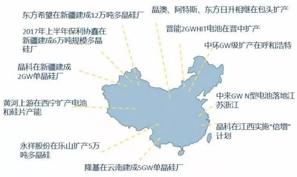 除了硅料環(huán)節(jié),各企業(yè)硅片環(huán)節(jié)的擴(kuò)產(chǎn)基本也都布局在西部地區(qū)。如單晶硅片龍頭企業(yè)隆基在云南楚雄布局了10GW的單晶硅片產(chǎn)能,將在2018年底投產(chǎn);晶澳、阿特斯、東方日升等企業(yè)在內(nèi)蒙也有擴(kuò)產(chǎn)。在此引用中國(guó)光伏行業(yè)協(xié)會(huì)王勃華秘書長(zhǎng)之前的圖片作為說(shuō)明。