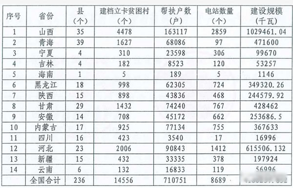 2017年,僅村級(jí)扶貧一項(xiàng)就幫扶14個(gè)省、236個(gè)光伏扶貧重點(diǎn)縣14556個(gè)建檔立卡貧困村的71.0751萬(wàn)戶建檔立卡貧困戶,如下表所示。