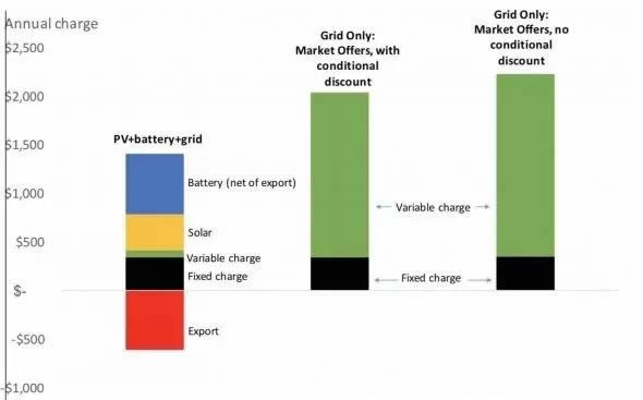 在澳大利亞,目前居民電價平均水平已經(jīng)達到0.424澳元/千瓦時(這是考慮部分折扣后的電價,如果不考慮折扣平均電價達到0.464澳元/千瓦時)。那么,如果澳大利亞居民無法忍受如此高昂的電網(wǎng)供電價格,自家安裝5千瓦的光伏系統(tǒng)(價格5500澳元,壽命20年),再加上特斯拉第二代電池包(Tesla Powerwall 2,容量13.5千瓦時,2018年售價11,075澳元),光伏余電上網(wǎng)電價收入0.16澳元/千瓦時,那么這一套系統(tǒng)每年的支出費用明顯低于電網(wǎng)電價。