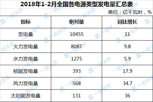 3月14日,國家統(tǒng)計局發(fā)布數(shù)據(jù)顯示,1-2月,全國發(fā)電量10455億千瓦時,同比增長11%,其中太陽能發(fā)電量131億千瓦時,同比增長36%,增速位居各電源類型之首(詳見下表)。