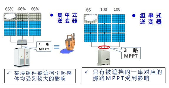 多路獨(dú)立的MPPT是組串式逆變器對比集中式逆變器很大的優(yōu)勢,其主要體現(xiàn)在適應(yīng)組件朝向不一致,降低單塊組件的局部陰影/臟污/老化/溫升/熱斑對其它組件功率輸出的影響。當(dāng)然,電站中獨(dú)立的MPPT路數(shù)越多,發(fā)電量越好。