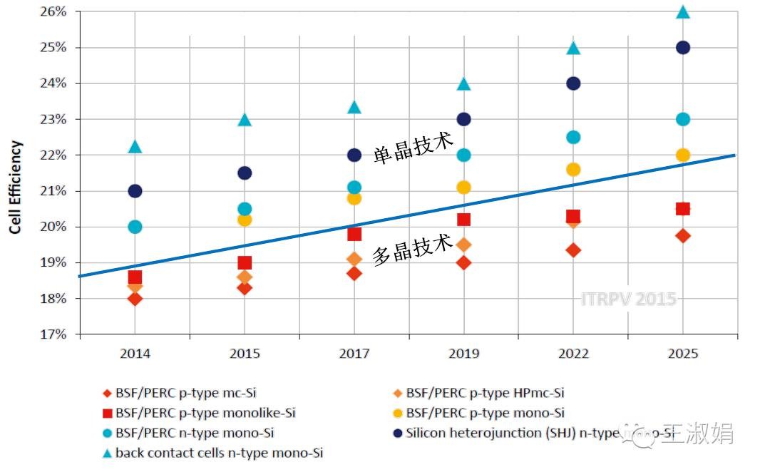 單晶在轉(zhuǎn)換效率方面優(yōu)勢更明顯,尤其PERC技術的量產(chǎn),對于單晶效率的提升顯著。另外,從產(chǎn)業(yè)技術趨勢來看,單晶技術路線相對其他技術路線擁有更高的轉(zhuǎn)換效率和更大的效率提升空間。圖6為2015國際光伏技術路線圖。