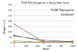 出現這些隱患的根源在于材料本身,通過測試及實際案例證明,PVDF薄膜除了本征橫向力學性能差的特點外,在紫外、濕熱、PCT或低溫老化測試中也發(fā)現,其橫向斷裂伸長率可降到5%以下,大大提高了光伏組件在戶外使用開裂的風險。