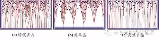 在此背景下,既無(wú)外觀瑕疵又無(wú)高密度位錯(cuò)的高效多晶應(yīng)運(yùn)而生。高效多晶應(yīng)屬于鑄錠多晶的范疇,為了區(qū)分其特殊性,本文將其單獨(dú)列出。為了系統(tǒng)對(duì)比鑄錠多晶、類(lèi)單晶和高效多晶的缺陷分布,筆者以示意圖的方式對(duì)三種晶體的各種缺陷進(jìn)行了比較,如圖(1)所示。