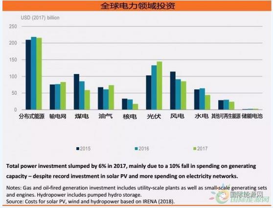 2017年全球電力投資額達(dá)7500億美元,同比下降6%。過(guò)去的十年,由于可再生能源項(xiàng)目開發(fā)補(bǔ)貼政策的出臺(tái),以及升級(jí)、擴(kuò)大電網(wǎng)等措施,全球電力行業(yè)成為資本需求高的行業(yè)。資本需求不高的熱發(fā)電投資所占份額繼續(xù)下降。