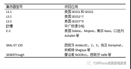 目前來看,有幾種類型的集熱器已被運用到最新型的槽式光熱電站當(dāng)中,如下表所示: