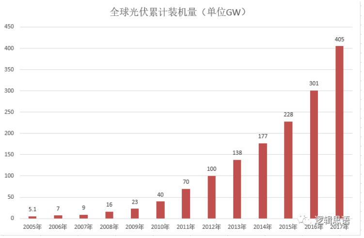 我們來看一組數(shù)據(jù),這是全球光伏裝機(jī)容量從2005年到2017年的累計(jì)裝機(jī)量統(tǒng)計(jì)。