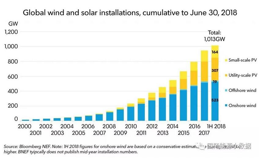 根據(jù)彭博新能源財(cái)經(jīng)(BNEF)匯總的數(shù)據(jù),至2018年6月底止全球風(fēng)電、光伏的累計(jì)裝機(jī)容量達(dá)到1,013吉瓦,超過了1,000吉瓦(1 TW)的里程碑。BNEF預(yù)計(jì)到2023年全球風(fēng)電、光伏將再凈增1,000吉瓦,屆時總裝機(jī)容量將達(dá)2,000吉瓦。