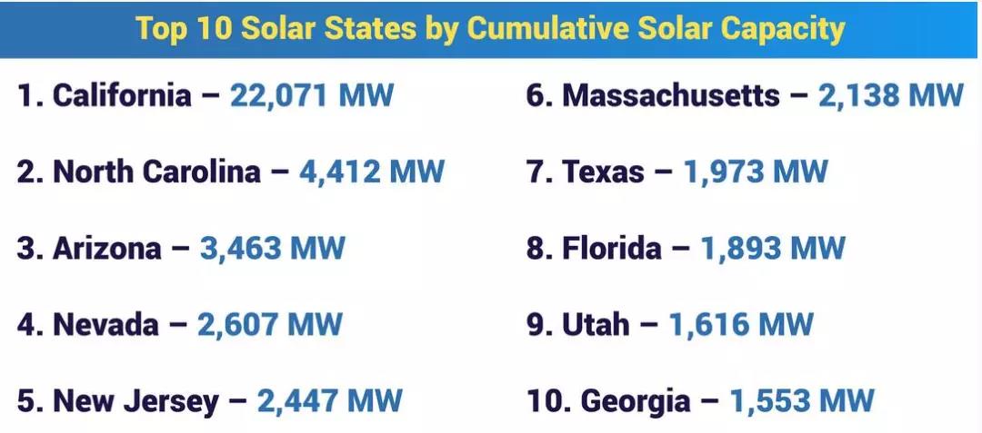 雖然加州主導著美國太陽能市場,但其他市場仍在繼續(xù)擴張,包括明尼蘇達州、南卡羅來納州、佛羅里達州和得克薩斯州。2017年排名前10位以外的州的安裝占總市場的比例達到28%。