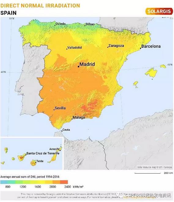 地處伊比利亞半島,西班牙受地中海氣候影響,夏季炎熱干燥,光照資源豐富,DNI(法向直接輻射)值通常都在2000kWh/m2/yr以上。每年夏季6~8月是光熱發(fā)電量最多的月份。同樣,光伏發(fā)電量在夏季光照充足的情況下也能達到峰值。