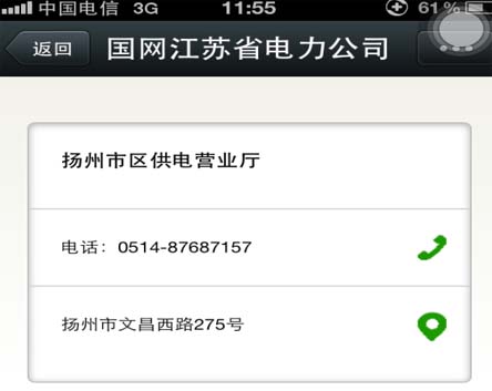 點擊“網(wǎng)點信息”,即會出現(xiàn)所屬城市的市區(qū)供電營業(yè)廳;點擊每欄右下角的綠色指示箭頭,便會有此供電營業(yè)廳的電話和地址,方便您進行電話直接咨詢。