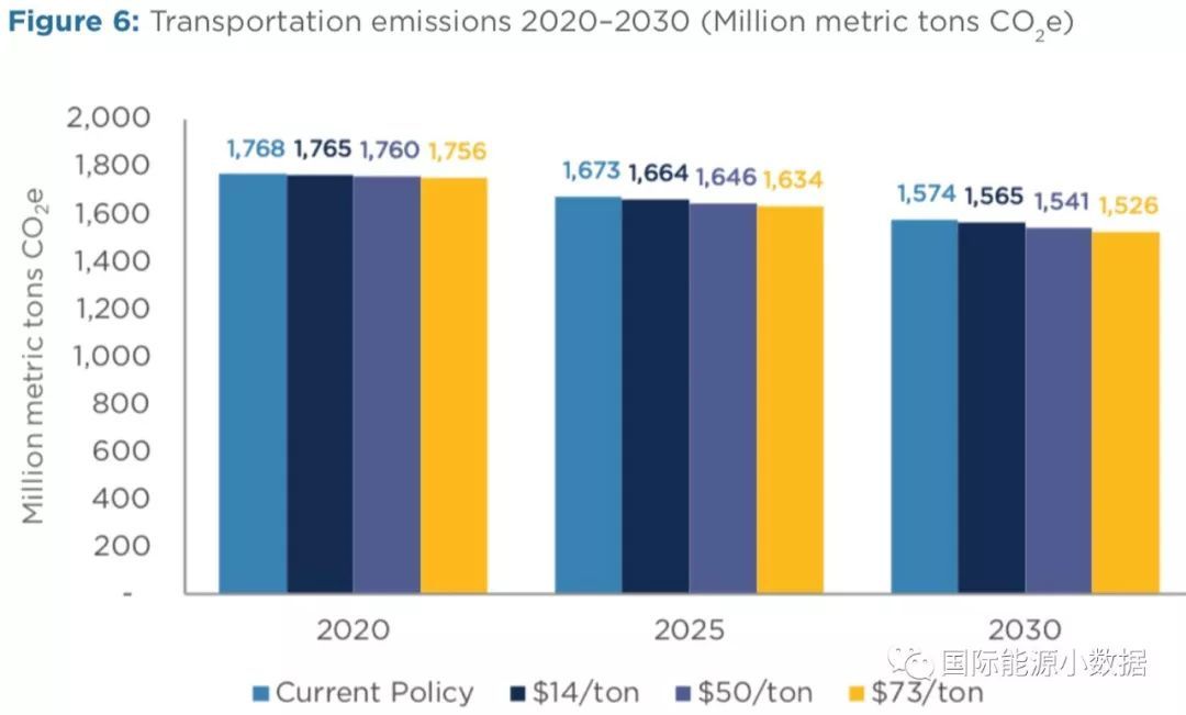 第二,碳稅對(duì)電力部門的煤電廠影響最大(煤電廠加速退役),到2030年因?yàn)樘级悓?shí)現(xiàn)的減排量中80%來(lái)自電力部門。如果碳稅為50美元/噸,那么2030年電力部門碳排放為6.76億噸,比沒有碳稅的情境下的排放量降幅達(dá)61%。而50美元/噸的碳稅對(duì)于交通部門的減排量影響非常小(-2%)。