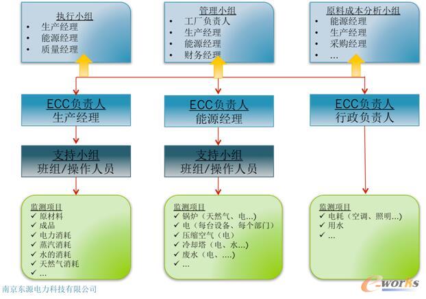 如上圖所示,對能源管理的責(zé)任應(yīng)該分散到ECC層級,如果一個部門內(nèi)不止一個ECC或一個班組,一線管理人員必須對他們自己的小部門或班組的能效負責(zé)。