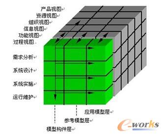 目前,較為流行的為集成化企業(yè)建??蚣埽鐖D所示:是一個(gè)由生命周期維、視圖模型維、通用性層次維組成三維立方體結(jié)構(gòu),如圖1所示。