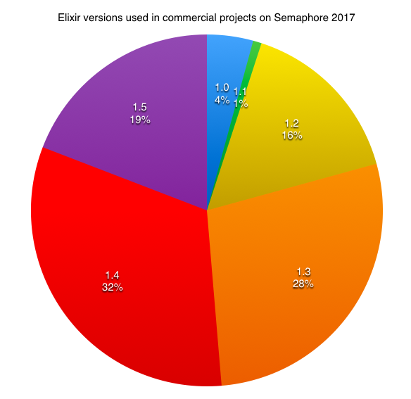 Elixir 是一個(gè)相當(dāng)年輕的語言,自然幾乎所有的項(xiàng)目都是基于最新版本的。40% 的項(xiàng)目使用的是今年發(fā)布的Elixir 1.4 及以上版本,該版本于 2016 年 1 月 1日發(fā)布。