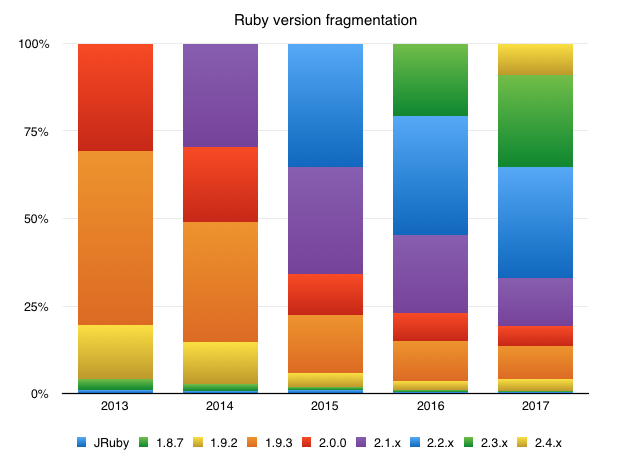 開源正在快速發(fā)展,Ruby 社區(qū)緊跟時(shí)代潮流。超過85%的項(xiàng)目使用 Ruby 2.0 及更高版本。