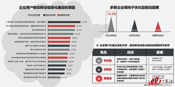 盡管企業(yè)用戶(hù)推動(dòng)移動(dòng)化建設(shè)的原因多種多樣,但以“優(yōu)化”為主的企業(yè)用戶(hù)占據(jù)了73.4%,成為主流。當(dāng)然,以“創(chuàng)新”與“顛覆”為驅(qū)動(dòng)因素的用戶(hù)也正迎頭趕上,勢(shì)頭正勁,占比分別達(dá)到了66.5%和62.4%。