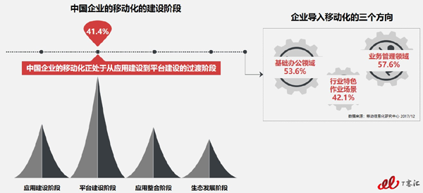 國(guó)內(nèi)企業(yè)的移動(dòng)化建設(shè)正處在從應(yīng)用向平臺(tái)階段過(guò)渡,其中處于該階段建設(shè)的企業(yè)已達(dá)41.4%。另外,企業(yè)導(dǎo)入移動(dòng)化主要從三個(gè)方向著手:業(yè)務(wù)管理領(lǐng)域(57.6%),基礎(chǔ)辦公領(lǐng)域(53.6%)以及行業(yè)特色作業(yè)場(chǎng)景(42.1%)。