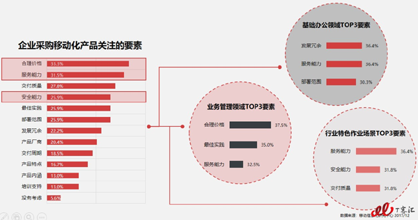 企業(yè)在采購(gòu)移動(dòng)化產(chǎn)品、服務(wù)時(shí),價(jià)格與服務(wù)是最關(guān)注的要素占比分別為33.3%,31.5%,同時(shí)安全能力也受到關(guān)注,達(dá)到25.9%。表明廠商在努力縮減企業(yè)采購(gòu)成本,提高服務(wù)能力的同時(shí),也要注重安全能力的構(gòu)建。
