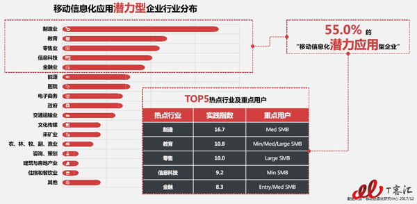 “新五大”熱門(mén)行業(yè):制造業(yè)、教育、零售業(yè)、信息科技和金融業(yè)為移動(dòng)信息化應(yīng)用提供了55%的潛增量用戶(hù),成企業(yè)移動(dòng)化必爭(zhēng)之地。在熱門(mén)行業(yè)中,SMB將成為行業(yè)市場(chǎng)的主宰,入門(mén)級(jí)企業(yè)市場(chǎng)已成過(guò)去。