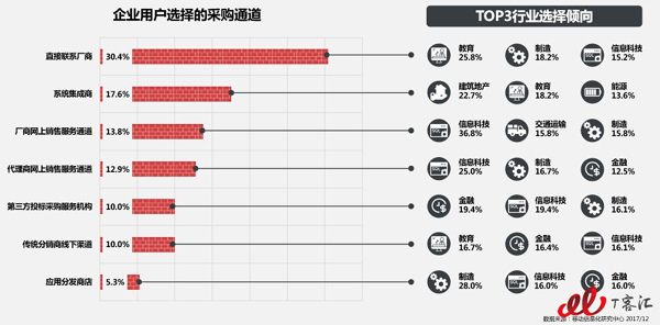 雖然行業(yè)用戶(hù)對(duì)不同采購(gòu)渠道的選擇不盡相同,但總的來(lái)看“新五大行業(yè)”對(duì)原廠更加偏愛(ài),采用直接聯(lián)系廠商的方式占30.4%。