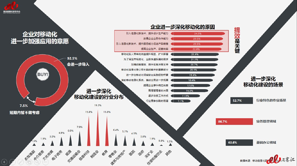 未來(lái),企業(yè)移動(dòng)化仍將繼續(xù)發(fā)展,而且企業(yè)對(duì)移動(dòng)化進(jìn)一步加強(qiáng)應(yīng)用的意愿很大,在調(diào)研中,有92.5%的用戶(hù)表示會(huì)進(jìn)一步導(dǎo)入移動(dòng)化應(yīng)用,從行業(yè)布局來(lái)看,制造業(yè),信息科技和教育行業(yè)的趨向更明顯,分別為19.2%,15.8%和15.8%;從應(yīng)用場(chǎng)景來(lái)看,業(yè)務(wù)管理領(lǐng)域、基礎(chǔ)辦公領(lǐng)域和行業(yè)特色作業(yè)場(chǎng)景表現(xiàn)最為突出,都達(dá)到了50%以上,其中業(yè)務(wù)管理領(lǐng)域甚至為86.7%。當(dāng)然,無(wú)論是從行業(yè)還是應(yīng)用場(chǎng)景來(lái)說(shuō),企業(yè)最終是以提高效率為主要目的來(lái)深化移動(dòng)化應(yīng)用。