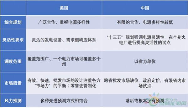 通過借鑒美國的成功經(jīng)驗,我們發(fā)現(xiàn)協(xié)調(diào)綜合規(guī)劃、重視電力系統(tǒng)靈活性、完善的電力市場和審慎的市場設(shè)計、擴大調(diào)度范圍、改善風(fēng)力預(yù)測是普及可再生能源的關(guān)鍵因素。以下表格總結(jié)了中國和美國的電力領(lǐng)域的五個特點。