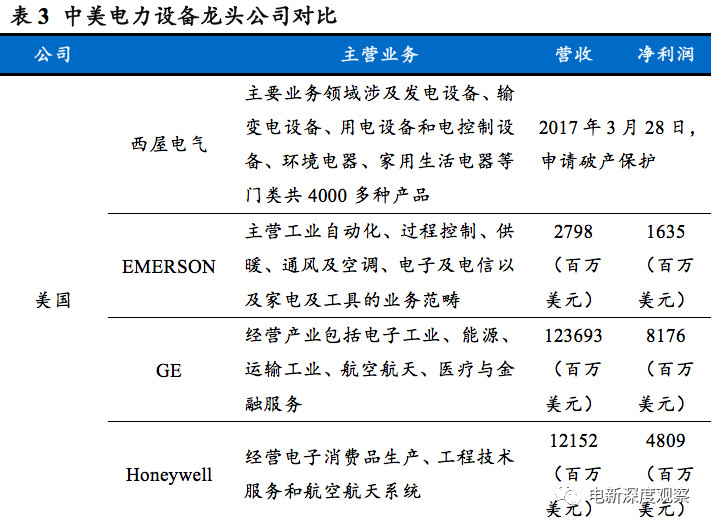 由于1975-1999年的20多年美國(guó)輸變電主網(wǎng)投資額處于停滯狀態(tài),因此美國(guó)電力設(shè)備龍頭均呈現(xiàn)多元化的業(yè)務(wù)結(jié)構(gòu)。通過(guò)中美電力設(shè)備龍頭公司的對(duì)比,美國(guó)電力設(shè)備公司與中國(guó)電力設(shè)備公司均在其傳統(tǒng)業(yè)務(wù)領(lǐng)域存在明顯瓶頸,美國(guó)電力設(shè)備龍頭多向其他領(lǐng)域轉(zhuǎn)型延伸,因此業(yè)績(jī)規(guī)模較大,中國(guó)電力設(shè)備龍頭的業(yè)務(wù)尚未多元化,業(yè)績(jī)規(guī)模相對(duì)較小。