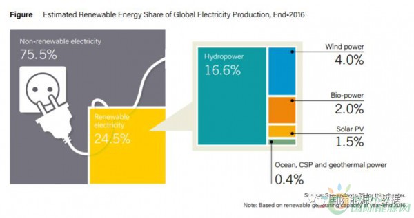 根據(jù)RE21最新發(fā)布的全球可再生能源現(xiàn)狀報告,2016年底全球可再生能源發(fā)電裝機達到2017吉瓦,占全球發(fā)電總裝機的30%,占總發(fā)電量24.5%。如下圖示,在24.5%的可再生能源發(fā)電量中,水電獨占16.6%,其次為風(fēng)電(4%)、生物質(zhì)發(fā)電(2%)、光伏(1.5%),光熱、地?zé)?、海洋能發(fā)電占0.4%。