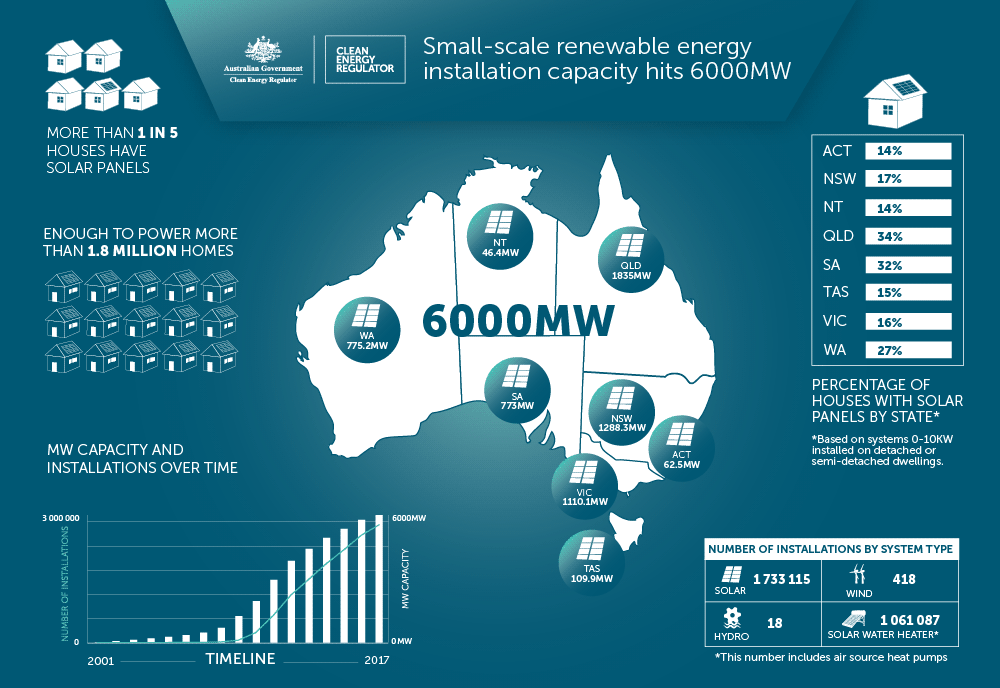 澳洲聯(lián)邦政府清潔能源監(jiān)管局(CER)近日公布,目前澳洲小型可再生能源項目裝機量已達(dá)到6000兆瓦,可為180萬戶家庭提供足夠的電力。CER表示,小型可再生能源項目是指發(fā)電量不超過100千瓦或不超過家庭項目平均裝機